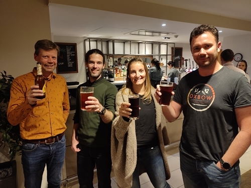 GWCT Fisheries Team members (L-R) Dr Rasmus Lauridsen, Will Beaumont, Dr Céline Artero and Thomas Lecointre enjoying a well deserved drink!