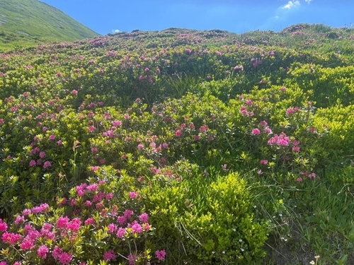 It is getting hotter and though the climb was a ‘mere’ 980m today, it was quite tough! The stunning views were mainly looking back onto the Grandes Jorasses (the same as yesterday), but once past the Col there were more grassy, flowery meadows to enjoy. An easy, but quite long hike down (10km) to Camping Les Glaciers.