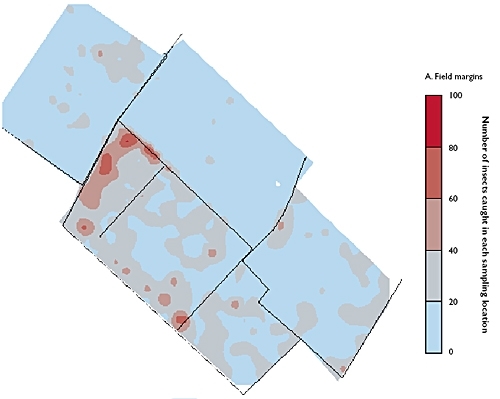 The uneven distribution patterns found indicate that levels of biocontrol are highly variable, but could be reduced by providing over-wintering habitat (e.g. beetle banks) and reducing cultivations (e.g. ploughing) that destroy larvae in the soil. Boundaries provide a source of insects in spring and a refuge from adverse field operations (e.g. insecticide applications and ploughing), but may also inhibit the movement of some species. Allowing some weeds to survive within the crop and having flower-rich borders surrounding crops will encourage predatory insects.