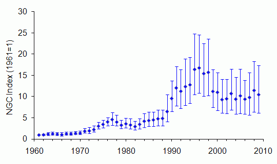 There has been a significant increase in the index of bag density between 1961 and 2009, rapidly so during the 1980s. This represents a period of recovery from very low levels caused by myxomatosis. The large confidence limits since 1985 are due to small annual sample sizes, and no trend is detectable from that point.