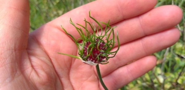 The wild onion is quite difficult to spot for much of the year because its chive-like leaves are easily camouflaged amongst grass. The self-fertile flowering head is much more obvious, appearing in June or July as a marble-sized ball covered in a papery sheath which breaks open to reveal a dense cluster of pink ‘bubils’. These are the main reproductive feature of the wild onion and can often be seen sprouting new shoots which appear as curled green tendrils, make the flowerhead look rather like Medusa! Sometimes, the bubils produce stalked pink flowers as well. The underground ‘true’ onion bulb is 1-2cm in diameter and this, along with the leaves and bubils have a strong onion-garlic flavour.
